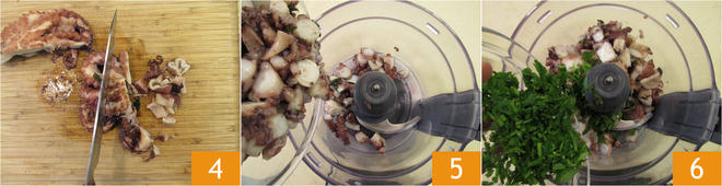 Ao fim do cozimento, o polvo deve estar muito macio, deve se "desfazer" facilmente. Uma vez cozido, escorra-o (reservando a água de cozimento que será usada para a maionese); então corte o polvo em pedaços ainda quente 4. Coloque tudo no copo de um liquidificador e adicione a salsa picada 6.