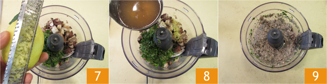 Rale a casca do limão 7, salgue e apimente a gosto, depois adicione um pouco de água de cozimento do polvo 8. Triture tudo. Enquanto bate, adicione um fio de óleo. Você deve obter uma massa macia, mas compacta 9.