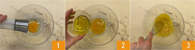 Para preparar os bolinhos de ricota e abobrinha com presunto cru, comece por colocar em uma tigela o ovo, o sal 1 e o óleo 2, depois misture bem com um batedor 3.