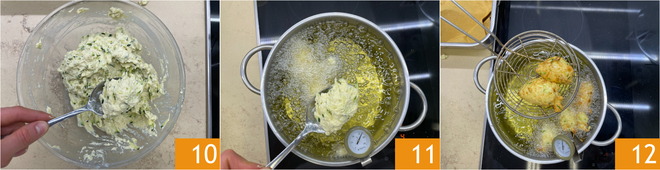 Com a colher, retire uma porção da massa 10 e mergulhe no óleo quente a 170º 11; frite poucos pedaços por vez para evitar que a temperatura do óleo baixe. Após 4-5 minutos, os bolinhos estarão dourados e cozidos no centro, então escorra-os 12. Com essas quantidades, você obterá cerca de 20 bolinhos.