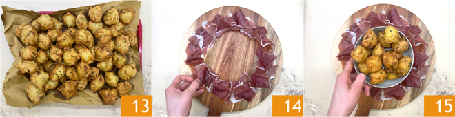 Transfira-os aos poucos para papel toalha 13. Quando estiverem todos prontos, monte a tábua: coloque as fatias de presunto cru ao longo da borda externa 14 e posicione no centro a tigela com os bolinhos de ricota e abobrinha com presunto cru ainda quentes 15!