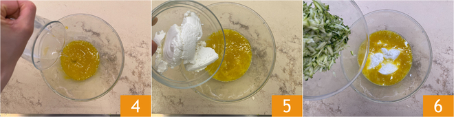 Adicione a água 4, a ricota 5 e as abobrinhas raladas com um ralador de furos grandes 6.