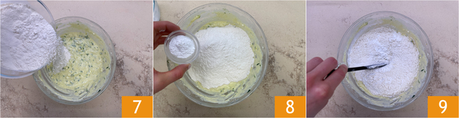 Após misturar, você pode adicionar a farinha 7 e o fermento 8. Misture delicadamente para evitar grumos 9.