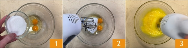 Para preparar os bolinhos de ricota e laranja com gotas de chocolate, quebre os ovos em uma tigela, adicione o açúcar 1 e bata com uma batedeira elétrica 2 até obter uma mistura clara e espumosa 3.