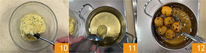 Aqueça o óleo vegetal em uma panela e leve-o a 170°C. Frite os bolinhos: pegue uma colher de massa 10 e mergulhe a massa no óleo quente 11. Cozinhe por 3/4 minutos ou até dourar, depois escorra os bolinhos 12.