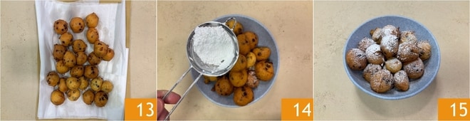Coloque-os em uma bandeja forrada com papel absorvente para secar o excesso de óleo 13. Deixe esfriar um pouco e, em seguida, decore com açúcar de confeiteiro a gosto 14. Os bolinhos de ricota e laranja com gotas de chocolate estão prontos para serem saboreados 15.