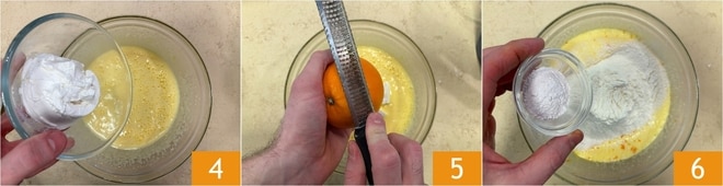 Incorpore a ricota drenada 4 e perfume a massa com a casca de uma laranja 5. Neste ponto, peneire os ingredientes secos e adicione-os à massa 6.