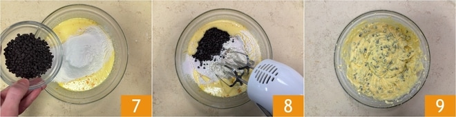 Complete com as gotas de chocolate 7 e misture novamente com a batedeira 8, até obter um composto homogêneo 9.