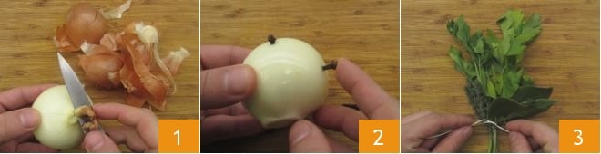 Para preparar o cozido, primeiro limpe a cebola 1, espete-a inserindo os cravos-da-índia em sua polpa 2. Faça um ramo aromático com tomilho, salsa e louro, depois amarre-o com um barbante de cozinha 3.