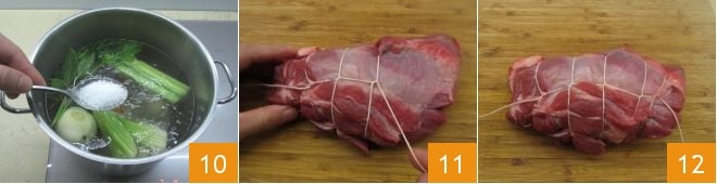 Adicione o sal 10 e leve ao ponto de fervura. Enquanto isso, amarre o pedaço de carne com um barbante de cozinha, para que mantenha a forma durante o cozimento (11-12). Para realizar a amarração, recomendamos consultar nossa página “Como amarrar o assado”.