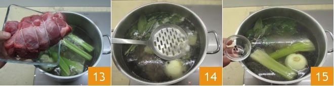 Assim que a água atingir a fervura, adicione a carne 13. Após alguns minutos de cozimento, impurezas começarão a surgir na superfície da água sob a forma de espuma: são as proteínas da carne coaguladas que você deve remover com uma escumadeira 14; depois de eliminar todas as impurezas, adicione os grãos de pimenta 15 (que, se adicionados antes, você corre o risco de eliminar com a escumadeira) e abaixe o fogo ao mínimo.