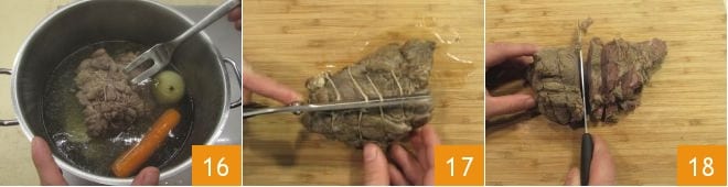 A fervura deve durar cerca de 3 horas e ser bem leve, pois se for violenta, destruirá a carne, desfiando-a e tornando-a seca; recomendamos verificar o nível de cozimento perfurando a carne com um garfo 16 para verificar a consistência. Quando o cozido estiver pronto, escorra-o com uma escumadeira, deixe-o escorrer e coloque-o sobre uma tábua, depois remova a amarração 17 (se você a fez) e corte-o em fatias de cerca de 1 cm de espessura usando uma faca de lâmina lisa e longa 18. Coloque as fatias de carne em um prato de servir e sirva com legumes cozidos e, se desejar, com um pouco de mostarda.
