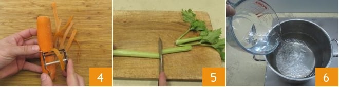 Descasque a cenoura 4, lave e corte as pontas do aipo 5. Os vegetais estão prontos, despeje a água em uma panela larga e de borda alta 6,