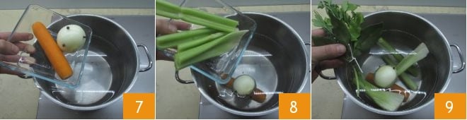 mergulhe a cenoura, a cebola 7, o aipo 8 e o ramo aromático 9.