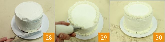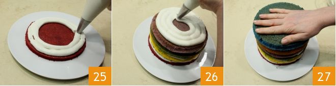 Quando as bases assadas estiverem completamente frias, você poderá montar o bolo: em um prato de servir, coloque a base vermelha, faça uma camada de creme de iogurte criando círculos concêntricos com o saco de confeitar com bico liso 25; continue alternando as camadas de pão de ló e creme 26 criando o arco-íris: após a base vermelha, a amarela, depois a verde, a roxa e finalmente a azul 27.