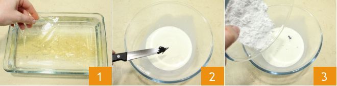 Para preparar o bolo arco-íris, comece pelo creme de iogurte: em uma tigela, coloque as folhas de gelatina de molho em água fria por pelo menos 10 minutos 1. Enquanto isso, em uma tigelinha, despeje 400 ml de creme de leite fresco líquido, adicione as sementes da fava de baunilha 2 e o açúcar de confeiteiro 3.