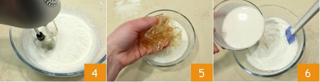 Bata o creme de leite com um batedor elétrico 4; depois escorra e esprema cuidadosamente as folhas de gelatina e coloque-as em uma tigelinha com 100 ml de creme de leite previamente aquecido 5: misture com uma colher para que a gelatina se dissolva completamente. Então, despeje o creme de leite morno em que você dissolveu a gelatina na tigela com o creme batido 6, e misture os dois compostos com uma espátula muito delicadamente.