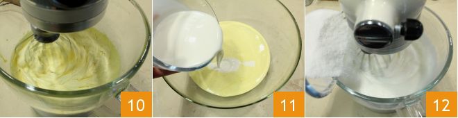 Quando o composto estiver claro e espumoso 10, transfira-o para uma tigela grande e adicione o creme de leite líquido muito delicadamente 11; misture com um batedor manual ou uma colher de pau e reserve; enquanto isso, bata as claras em neve. Quando estiverem brancas, adicione também a metade restante do açúcar 12 e continue a bater.