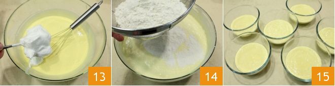 Adicione as claras ao composto de ovos 13, misturando de cima para baixo para não desmontá-las; depois peneire também a farinha e o fermento 14; misture cuidadosamente com uma colher de pau o composto e divida-o em 6 tigelinhas 15.