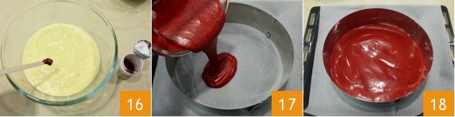 Colore cada tigelinha com corante em gel ou pasta, adicionando em pequenas doses até obter a cor desejada: vermelho 16, amarelo, verde, laranja, roxo e azul (você pode dissolver o corante com uma colher de água para que ele se misture mais facilmente ao composto). Em uma assadeira forrada com papel manteiga, coloque um aro de confeitaria de 18 cm de diâmetro (você também pode usar uma forma redonda do mesmo tamanho) e despeje a massa colorida 17; asse uma base de cada vez em forno pré-aquecido a 200°C por cerca de 10 minutos (se forno ventilado 180°C por cerca de 5-6 minutos).