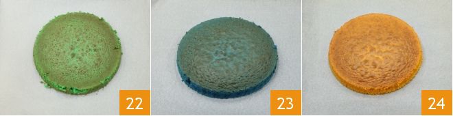 depois faça também as outras bases seguindo o mesmo procedimento para obter o pão de ló verde 22, azul 23 e laranja 24 para ter todas as bases prontas para o bolo arco-íris.