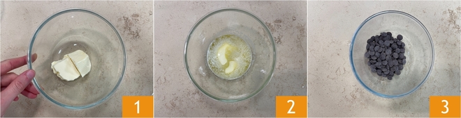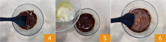 Derreta o chocolate da mesma forma, no micro-ondas 4 ou em banho-maria. Agora despeje a manteiga derretida no chocolate 5 e mexa para misturar bem 6.