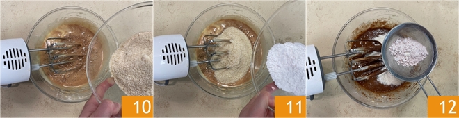 Agora incorpore a farinha de amêndoas 10, a fécula de batata 11 e o fermento peneirado 12.