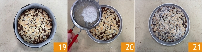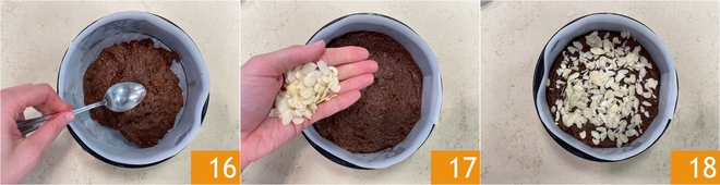Distribua bem a massa nivelando a superfície com as costas de uma colher 16, depois espalhe por cima as lâminas de amêndoa 17 e asse em forno estático a 160°C por cerca de 40 minutos 18.
