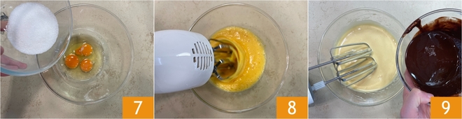 Em uma tigela, junte os ovos e o açúcar 7, depois bata com as batedeiras elétricas 8 até obter uma mistura clara e espumosa. Nesse momento, incorpore a mistura de chocolate e manteiga 9.
