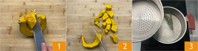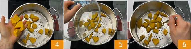 Coloque a abóbora 4, cubra 5 e deixe cozinhar por 10 minutos ou até que esteja macia, teste a consistência espetando a abóbora com um garfo 6.