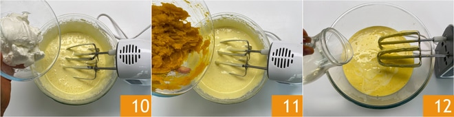 Quando a mistura estiver espumosa, adicione o iogurte 10, a polpa de abóbora 11 e o óleo de sementes 12.