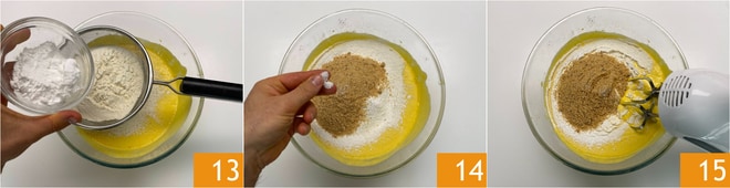 Desligue a batedeira e peneire a farinha, amido de milho e fermento 13. Adicione também a farinha de avelã e o sal 14, misture novamente com a batedeira 15 para obter uma massa homogênea.