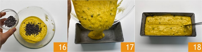Complete com as gotas de chocolate, reservando um pouco para a superfície 16. Transfira a massa para uma forma de 22 cm x 8,5 cm, com 7 cm de altura, untada e enfarinhada 17, afunde a ponta de uma faca – embebida em óleo – ao longo de toda a superfície como se fosse dividir ao meio no sentido do comprimento.
