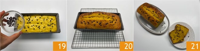 Adicione as gotas reservadas 19 e asse em forno estático pré-aquecido a 170° por 55/60 minutos. Retire do forno e deixe esfriar 20, depois desenforme e sirva o bolo inglês de abóbora e chocolate 21.
