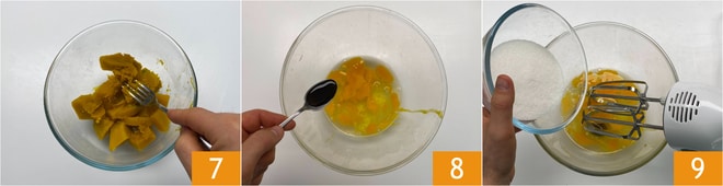 Uma vez pronta, amasse a abóbora com um garfo 7 e reserve. Enquanto isso, bata os ovos com baunilha 8 e açúcar 9 usando uma batedeira elétrica.