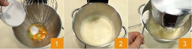 Para preparar o bolo de ameixa de dois sabores de pistache e laranja, enfarinhe as gotas de chocolate e coloque-as no congelador por cerca de 2 horas. Em uma batedeira com batedor, coloque os ovos e o açúcar 1, ligue a máquina e bata até obter uma mistura espumosa e clara 2. Adicione a farinha e o fermento peneirados, uma colher de cada vez 3,