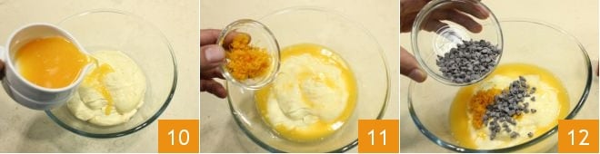 Na outra tigela com a massa, adicione o suco de laranja 10, a casca ralada 11, as gotas de chocolate 12