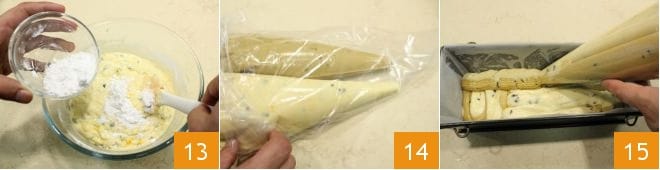 e o amido de batata 13. Misture delicadamente e depois despeje as duas misturas em dois sacos de confeitar sem bico e, em seguida, insira os dois sacos de confeitar em um maior que possa contê-los 14, unte e forre com papel manteiga uma forma de bolo de ameixa de 28 x 11 cm, encha a forma apertando as duas misturas, obtendo uma massa bicolor 15.