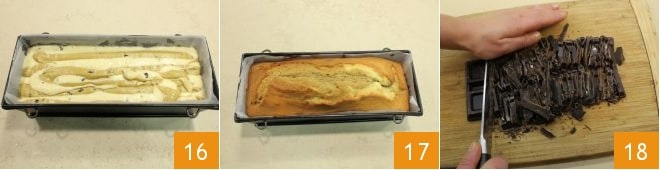 Quando terminar de apertar as duas misturas 16, asse o bolo de ameixa em forno pré-aquecido estático a 170° por 60 minutos (ou em forno ventilado a 150° por 50 minutos). Uma vez assado, retire do forno 17 e deixe amornar, depois desenforme sobre uma grelha e deixe esfriar. Prepare a ganache: pique o chocolate amargo 18