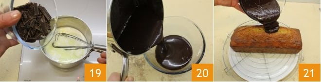 aqueça o creme de leite em uma panela até atingir a fervura, e despeje o chocolate picado 19, misture para derreter o chocolate e obter um creme liso 20. Despeje a ganache sobre o bolo de ameixa, cuidando para colocar um prato sob a grelha para coletar o creme em excesso 21.