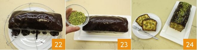 Quando todo o bolo de ameixa estiver coberto com a ganache 22, transfira o bolo de ameixa para um prato de servir e decore a superfície com a granela de pistache 23. O Bolo de Ameixa de dois sabores de pistache e laranja está pronto para ser saboreado 24.