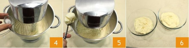 o sal 4 e, por último, a manteiga amolecida, um pedaço de cada vez 5, esperando que o anterior seja absorvido antes de adicionar outro, quando a massa estiver homogênea e lisa, desligue a batedeira. Divida a mistura em duas tigelas 6 (cerca de 400 g cada uma)