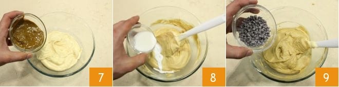 em uma tigela adicione a pasta de pistache 7, o leite 8 e 50 g de gotas de chocolate 9, misture suavemente com uma espátula para incorporar a mistura