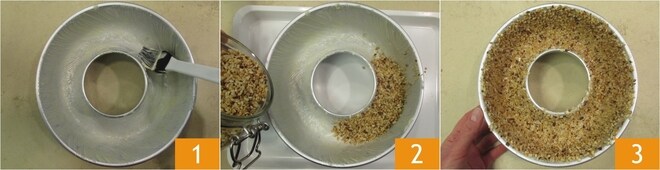 Para preparar o bolo de avelã, primeiro unte uma forma de buraco no meio com diâmetro de 20 cm 1, depois despeje a granela de avelã 2 de forma a cobrir tanto a base quanto as laterais 3.