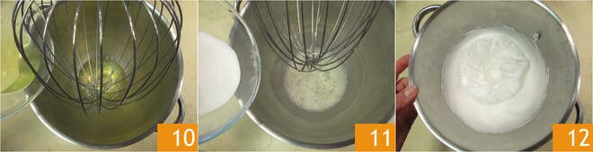 Reserve a mistura de gemas e coloque as claras na tigela de uma batedeira equipada com batedor 10. Comece a bater, depois adicione 120 g de açúcar, mantendo sempre o batedor em ação 11. Você deve obter uma consistência bem cremosa 12.