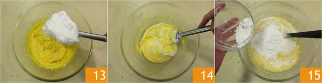 Incorpore as claras em neve na mistura de gemas 13, mexendo delicadamente com uma espátula 14. Comece adicionando primeiro um terço das claras em neve e depois o restante. Adicione a farinha de trigo e o amido de milho 15 e misture novamente.
