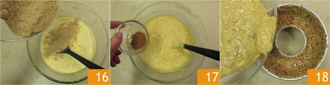 Por fim, incorpore também a farinha de avelã 16 e a canela 17. Despeje a massa obtida na forma untada e coberta com avelãs 18, depois bata-a suavemente na bancada.