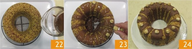 Decore o bolo com chocolate gianduia derretido 22 e complete com avelãs inteiras torradas 23. Seu bolo de avelã está pronto para ser saboreado 24!