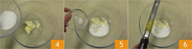 Reserve a forma e prepare a massa: primeiro, separe as claras das gemas. Coloque a manteiga amolecida e 55 g de açúcar em uma tigela 4, adicione o sal 5 e as raspas de limão 6. Bata com a batedeira para transformar os ingredientes em creme.