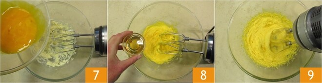 Agora, adicione as gemas 7 e o conhaque 8, continuando a bater até obter uma mistura lisa e homogênea 9.